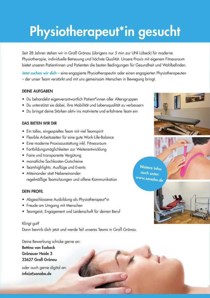 Sie suchen eine moderne Krankengymnastikpraxis in Ihrer Nähe? Wir bieten Ihnen modernste Behandlungsmethoden durch hoch qualifizierte Physiotherapeutinnen in freundlich gestalteten Praxisräumen in Groß Grönau bei Markant. Parkflächen direkt vor der Praxis.
